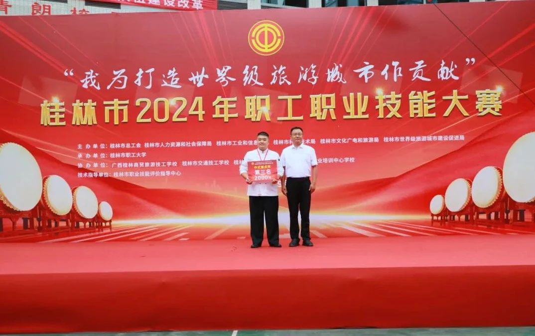 桂林市人社局職業(yè)能力建設(shè)科科長吳政鴻、桂林市總工會勞動與經(jīng)濟(jì)工作部部長葛雷為第三名選手頒獎