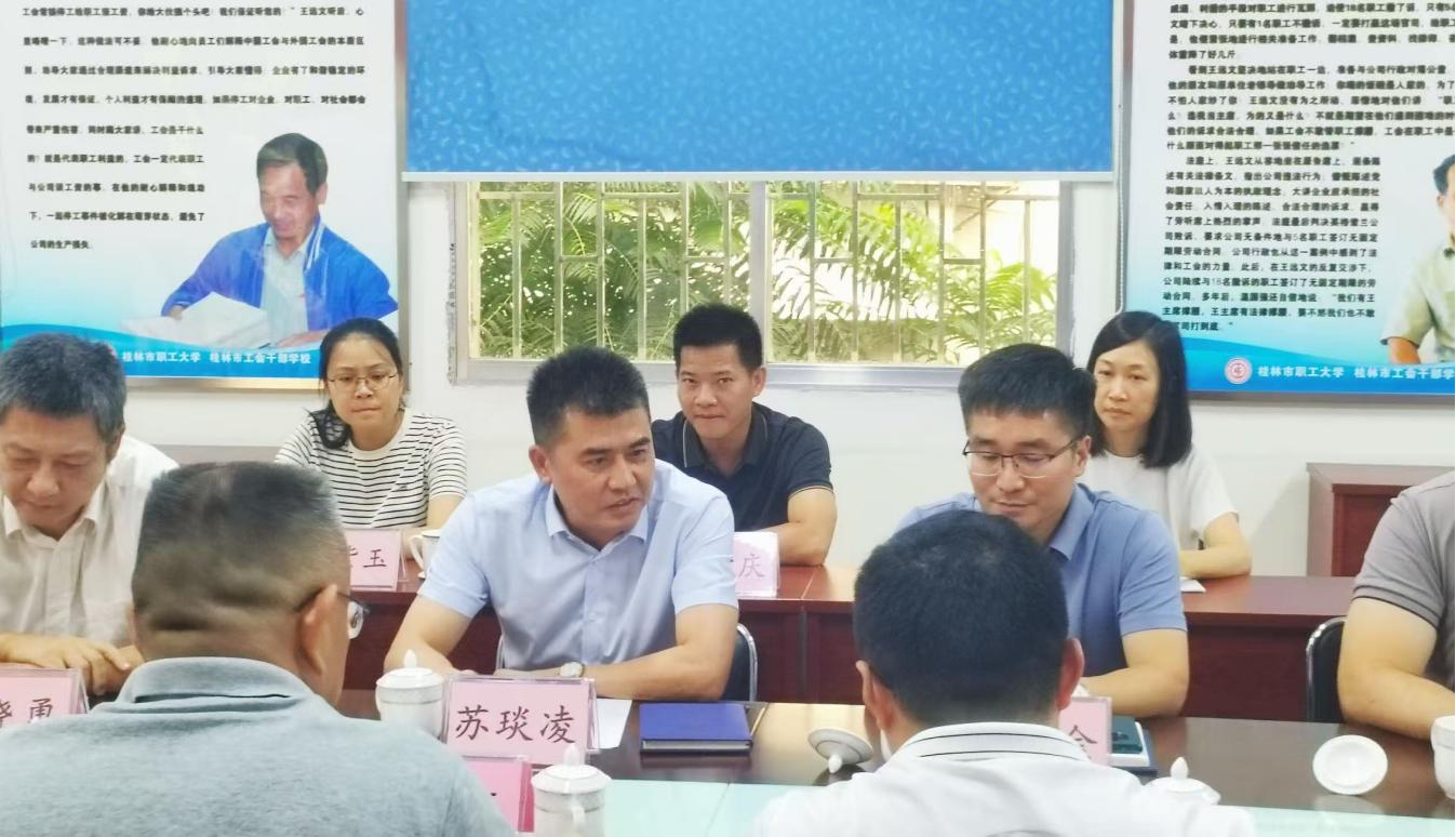 實地考察結(jié)束后,調(diào)研組與學(xué)校相關(guān)負責(zé)人、工匠代表召開座談會,深入交流工匠培育與產(chǎn)業(yè)工人隊伍建設(shè)工作。桂林市職工大學(xué)校長、黨支部書記蔣大為匯報了學(xué)校圍繞職工學(xué)歷技能“雙提升”、工會干部“精準(zhǔn)化”培訓(xùn)、企業(yè)職工“產(chǎn)教融合”技能培訓(xùn)、職工技能“以賽促訓(xùn)”、職工心理健康“守護行動”、“桂林工匠”培育與服務(wù)等六大板塊,系統(tǒng)構(gòu)建產(chǎn)業(yè)工人培養(yǎng)鏈的探索與實踐。