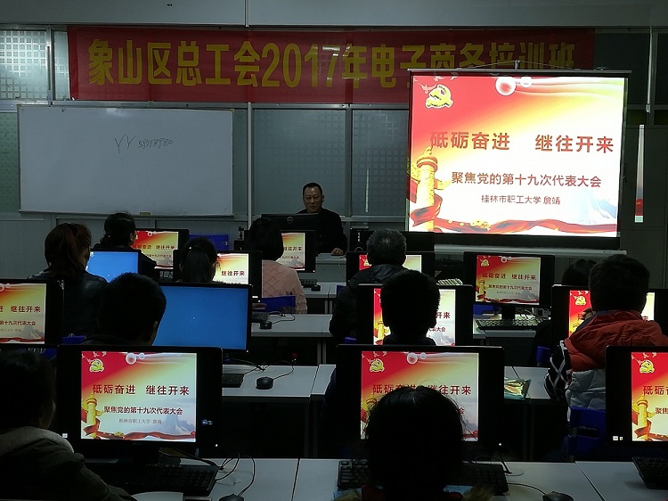 2017年11月28日晚上,在桂林市職工大學舉辦的象山區(qū)總工會2017年電子商務培訓班迎來了一堂“特殊”的課,學員們?nèi)褙炞?、認真聽講,不時與老師互動,不時發(fā)出陣陣熱烈地掌聲。這,就是桂林市職工大學為培訓班開設的十九大精神宣講課。詹靖校長結(jié)合互聯(lián)網(wǎng)國家戰(zhàn)略和國家?guī)头雠嘤柣菝裾?,從黨的十九大會議主題、過去五年的工作和歷史性變革、習近平總書記報告的核心要義、十九大取得的重大成果等四個方面向電商培訓班學員們宣講了黨的十九大精神,并用“行百里者半九十”、“砥礪奮進,不忘初心”與大家共勉,祝愿參加培訓的學員學有所成,創(chuàng)業(yè)成功。