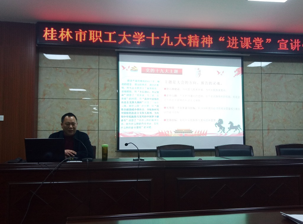 12月12日晚上,十九大精神“進課堂”宣講會在桂林市職工大學(xué)多媒體教室舉行。2016級大專班師生聆聽了報告。