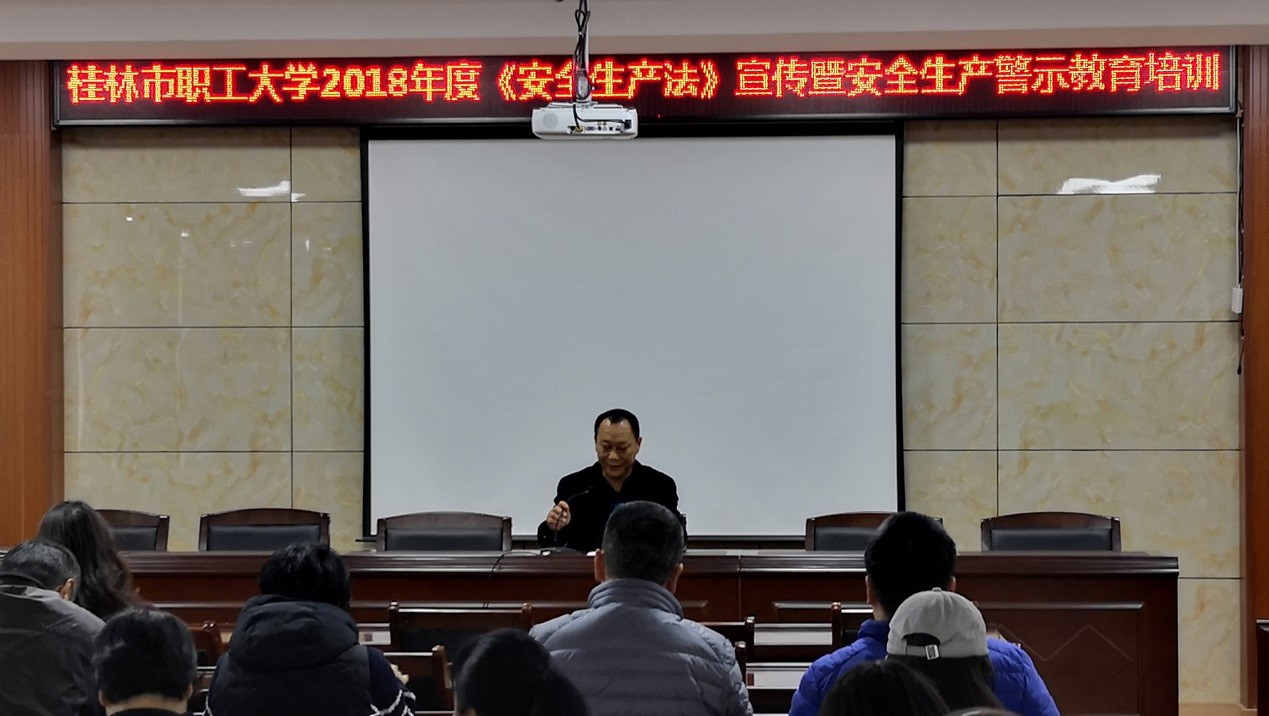 2018年12月6日桂林市職工大學(xué)組織全體教職工及各門面租戶認(rèn)真學(xué)習(xí)了《安全生產(chǎn)法》并觀看了安全生產(chǎn)警示教育片。會上龍云枝副校長給大家詳細的解讀了《安全生產(chǎn)法》并布置了自治區(qū)成立60周年慶?;顒悠陂g及今冬明春期間的社會治安綜合治理穩(wěn)定的工作安排和要求,學(xué)校后勤保障工作部向各門面租戶發(fā)放了社會治安綜合治理穩(wěn)定及門面衛(wèi)生工作的告知書。培訓(xùn)結(jié)束后,詹靖校長提出了三點要求:一是參加培訓(xùn)的各門面的代表要將學(xué)校的相關(guān)要求及培訓(xùn)的知識及時傳達到每位員工,學(xué)校部門分管領(lǐng)導(dǎo)要具體抓好落實;二是大家要增強安全生產(chǎn)紅線意識,繃緊安全生產(chǎn)這根弦不能放松;三是進步一完善安全生產(chǎn)監(jiān)管體制,提升應(yīng)急能力。
