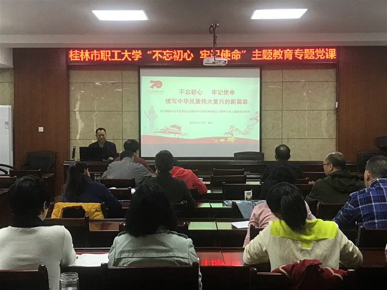 10月25日上午9:00,我校在131教室召開了“不忘初心、牢記使命”主題教育專題黨課,校黨支部書記、校長詹靖領(lǐng)學(xué)了習(xí)近平總書記在慶祝中華人民共和國成立七十周年大會(huì)上的重要講話。全體教職工、黨員參加了學(xué)習(xí)。