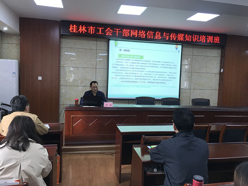2019年11月14日,桂林市工會干部網絡信息與傳媒知識培訓班在我校舉辦。來自各縣(市)區(qū)總工會、各產業(yè)工會、部分市總直管基層工會專兼職工會干部,以及我校全體教職工參加此次培訓班。桂林市總工會掛職副主席黃錦堂、桂林市工會干部學校(桂林市職工大學)校長詹靖、桂林市總工會網絡工作部周堅部長、玉明副部長參加開班儀式。