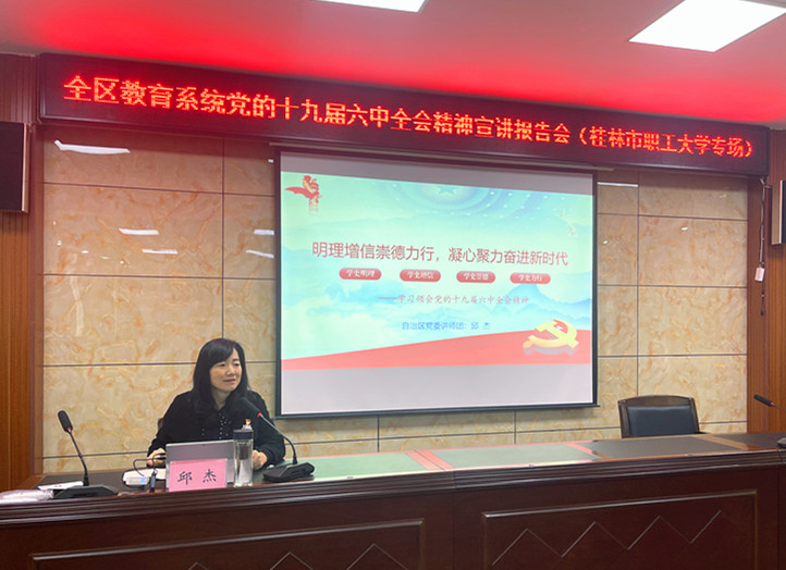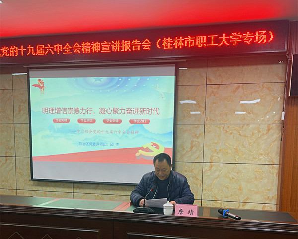報告會上,邱杰教授以“明理增信崇德力行,凝心聚力奮進新時代”為題,從黨的十九屆六中全會概況、學懂弄通準確把握大會決議的核心要義、增信力行接續(xù)奮斗實現偉大復興三個方面,結合習近平總書記視察廣西及桂林重要講話精神、中國共產黨廣西壯族自治區(qū)第十二次代表大會,系統(tǒng)地講解了全會的重大意義、主要內容和豐富內涵,深入解讀了中國共產黨百年奮斗的寶貴經驗和實踐啟示。