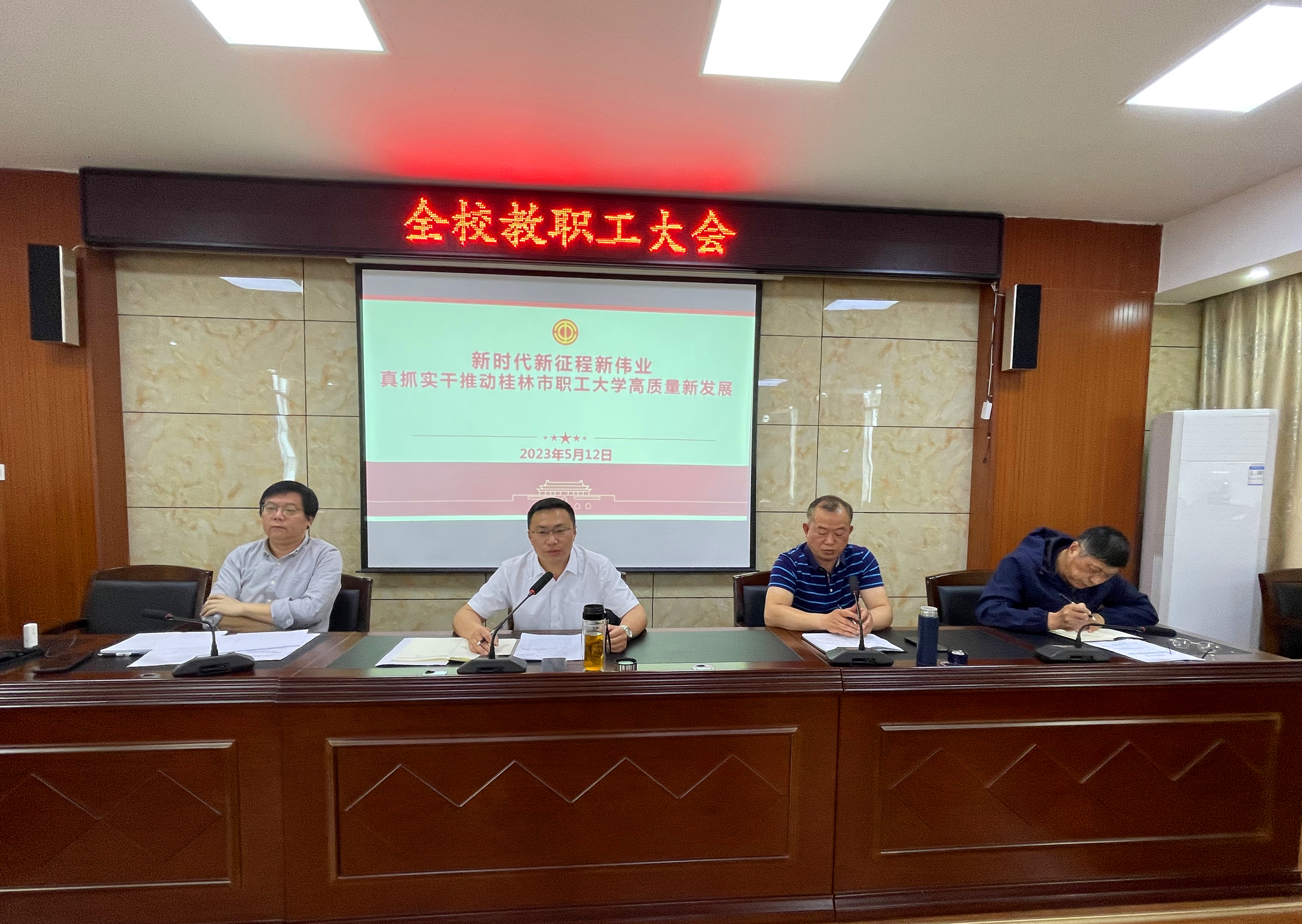 5月12日下午,桂林市職工大學(xué)召開了以“新時(shí)代新征程新偉業(yè),真抓實(shí)干推動(dòng)桂林市職工大學(xué)高質(zhì)量新發(fā)展”為主題的全體教職工會(huì)議,會(huì)議由學(xué)校副校長(zhǎng)謝永祥主持。會(huì)議分析學(xué)校發(fā)展面臨的新問題、新挑戰(zhàn),全面安排部署了近期工作,凝聚共識(shí),振奮精神,充分調(diào)動(dòng)教職工的干事創(chuàng)業(yè)熱情。