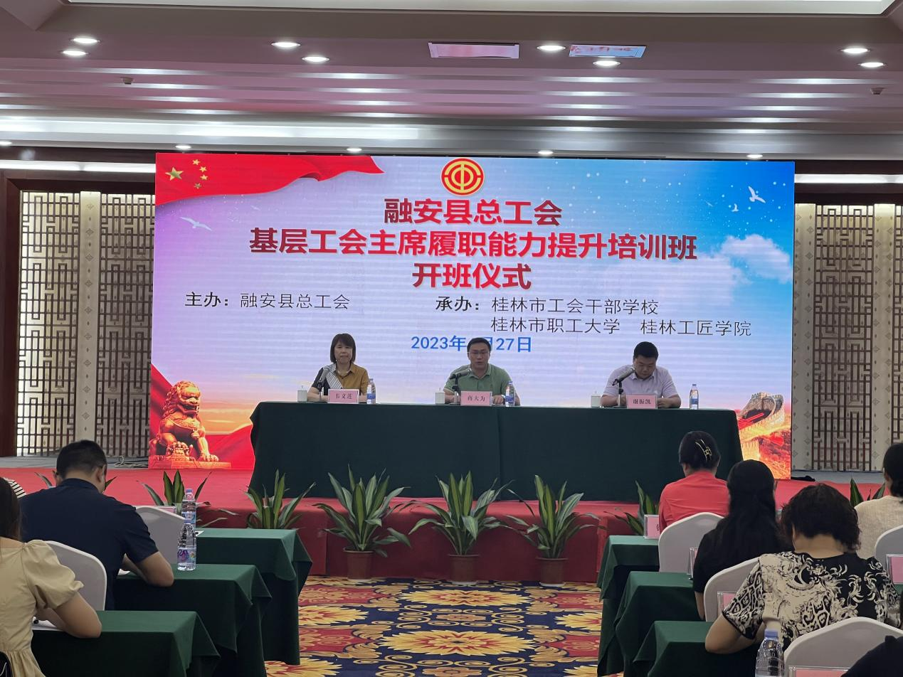 6月27日,由融安縣總工會(huì)主辦,桂林市工會(huì)干校(桂林市職工大學(xué)、桂林工匠學(xué)院)承辦的2023年融安縣總工會(huì)基層工會(huì)主席履職能力提升培訓(xùn)班在陽朔順利開班。來自融安縣各基層工會(huì)的近60位工會(huì)主席參加本次培訓(xùn)。桂林市工會(huì)干校(桂林市職工大學(xué)、桂林工匠學(xué)院)校長(zhǎng)蔣大為、融安縣總工會(huì)黨組成員、副主席韋義蓮出席了培訓(xùn)班開班儀式并作動(dòng)員講話,桂林市工會(huì)干校(桂林市職工大學(xué)、桂林工匠學(xué)院)培訓(xùn)部部長(zhǎng)謝振凱主持開班儀式。
