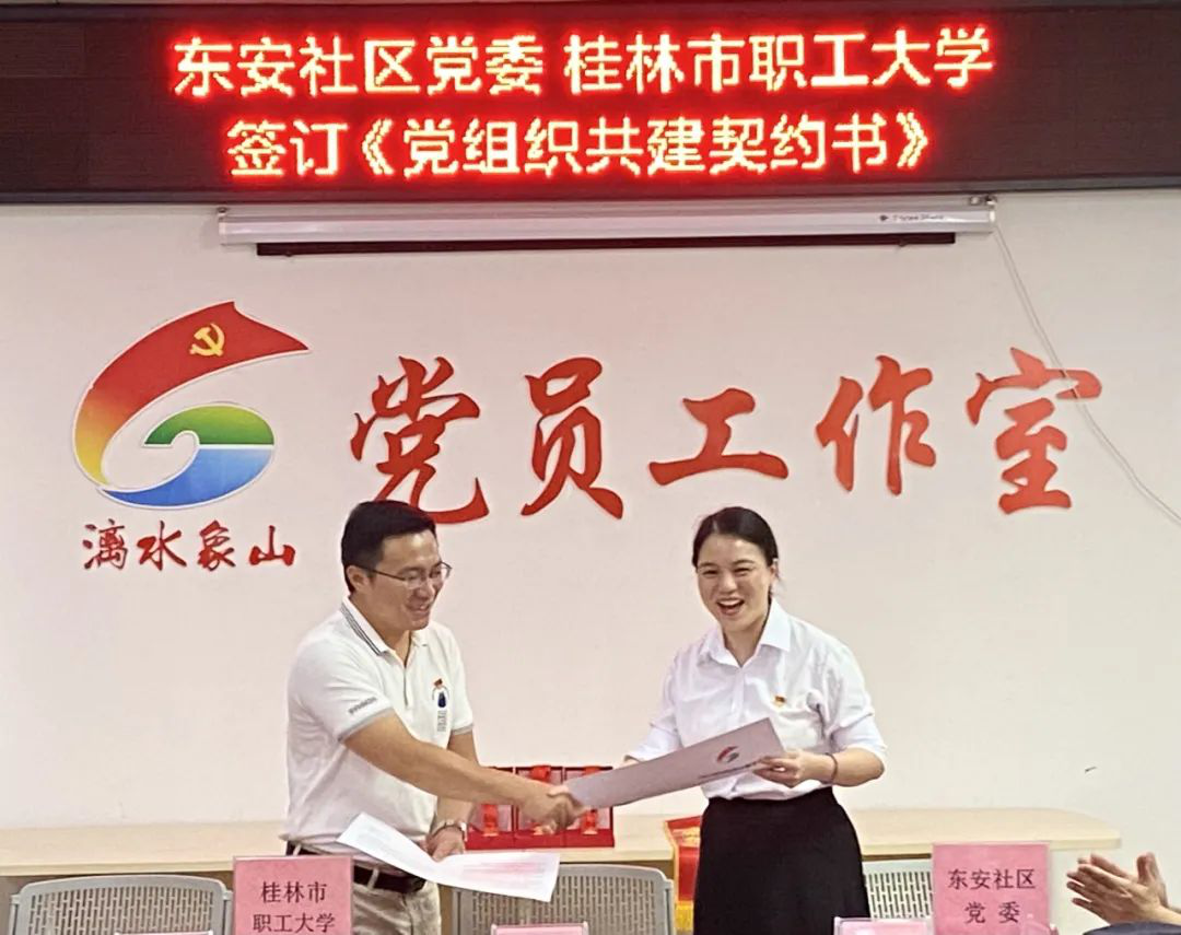 活動(dòng)于6月30日上午在東安社區(qū)黨員活動(dòng)中心舉行。首先,桂林市職工大學(xué)黨支部書記、校長蔣大為與東安社區(qū)黨委書記、主任萬霞共同簽署了《基層黨建共建契約書》,這標(biāo)志著雙方黨建共建工作正式啟動(dòng),雙方將在黨建共建的平臺(tái)上,就基層組織建設(shè)、理論宣講、結(jié)對(duì)幫扶、特色活動(dòng)和志愿服務(wù)等方面進(jìn)行廣泛合作和深度對(duì)接。