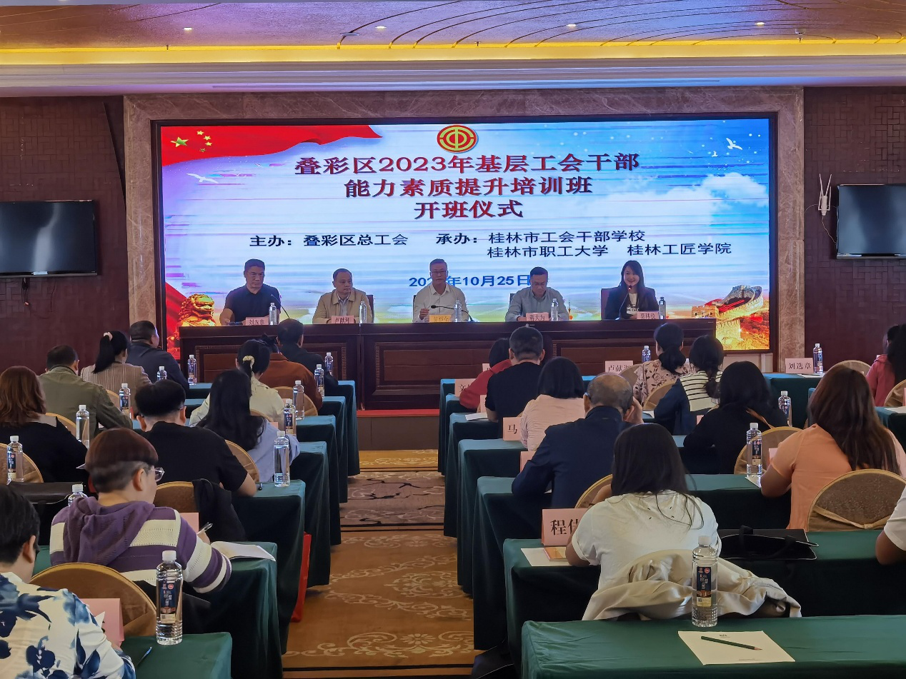 10月25日,疊彩區(qū)2023年基層工會干部能力素質(zhì)提升培訓(xùn)班在龍勝縣開班。開班儀式上,疊彩區(qū)委常委、區(qū)委組織部部長黃炬全作動員講話。桂林市職工大學(xué)(桂林市工會干部學(xué)校、桂林工匠學(xué)院)書記、校長蔣大為出席開班儀式并致辭,職工大學(xué)培訓(xùn)部副部長莫瑋儀主持開班儀式。