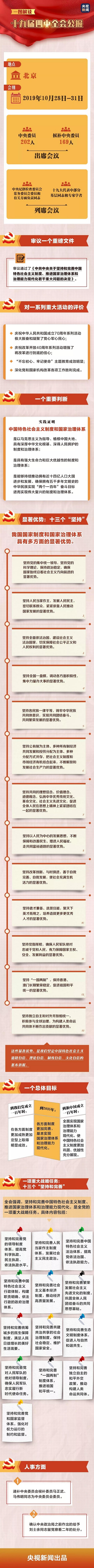 中國共產(chǎn)黨第十九屆中央委員會第四次全體會議,于2019年10月28日至31日在北京舉行。十九屆四中全會決定了哪些大事?有什么重點(diǎn)內(nèi)容?一張圖,帶你了解。
