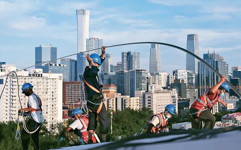 圖為2022年7月18日,在北京工人體育場(chǎng)改造復(fù)建工程的頂棚上,工人在太陽(yáng)的余暉下作業(yè)。工人日?qǐng)?bào)記者 吳凡/攝