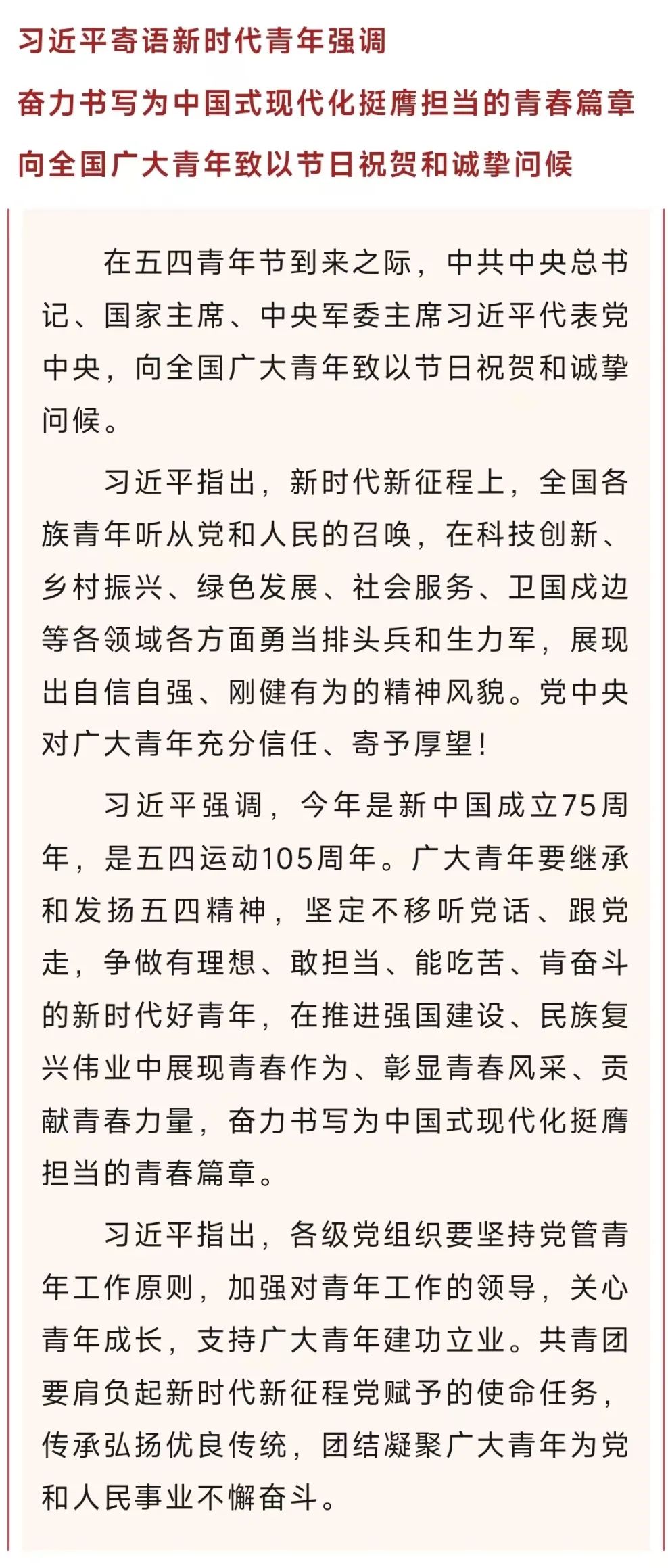 習(xí)近平向全國廣大青年致以節(jié)日祝賀和誠摯問候