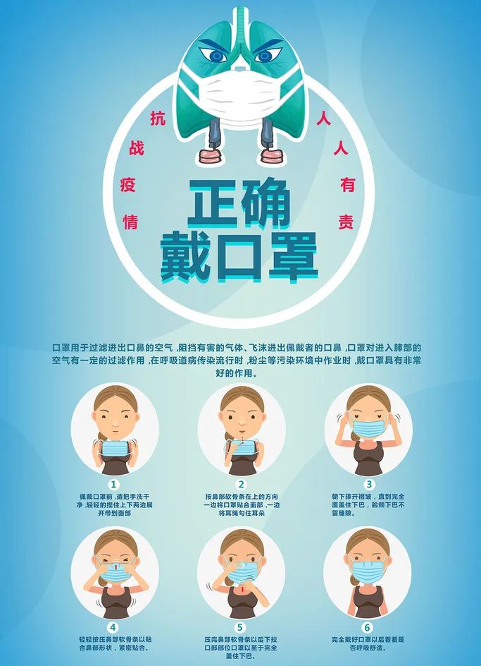 4.防護(hù)型口罩的佩戴方法以KN95(N95)口罩為例:口罩有標(biāo)識(shí)的一面向外,有金屬條的一邊向上;系緊固定口罩的帶子,或把口罩的橡皮筋繞在耳朵上,使口罩緊貼面部。繼續(xù)使用的,取下口罩后應(yīng)對(duì)折放入專用塑料袋中,并放入干燥劑保持干燥。