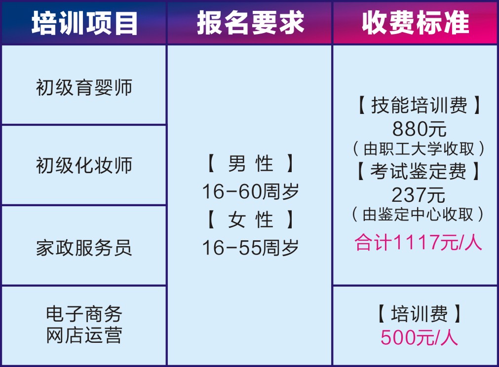 備注:符合國家政策的五大類人員(農(nóng)村轉(zhuǎn)移就業(yè)勞動者、城鎮(zhèn)登記失業(yè)人員、貧困家庭子女(指建檔立卡貧困家庭、城鄉(xiāng)低保家庭、城鎮(zhèn)零就業(yè)家庭子女)、畢業(yè)年度高校畢業(yè)生(含技師學(xué)院高級工班、預(yù)備技師班和特殊教育院校職業(yè)教育類畢業(yè)生)、城鄉(xiāng)未繼續(xù)升學(xué)的應(yīng)屆初高中畢業(yè)生)可申請國家補貼享受免費培訓(xùn)。詳情請詢問職工大學(xué)職工教育培訓(xùn)部,聯(lián)系電話:0773-2110002/0773-2110013(傳真)。