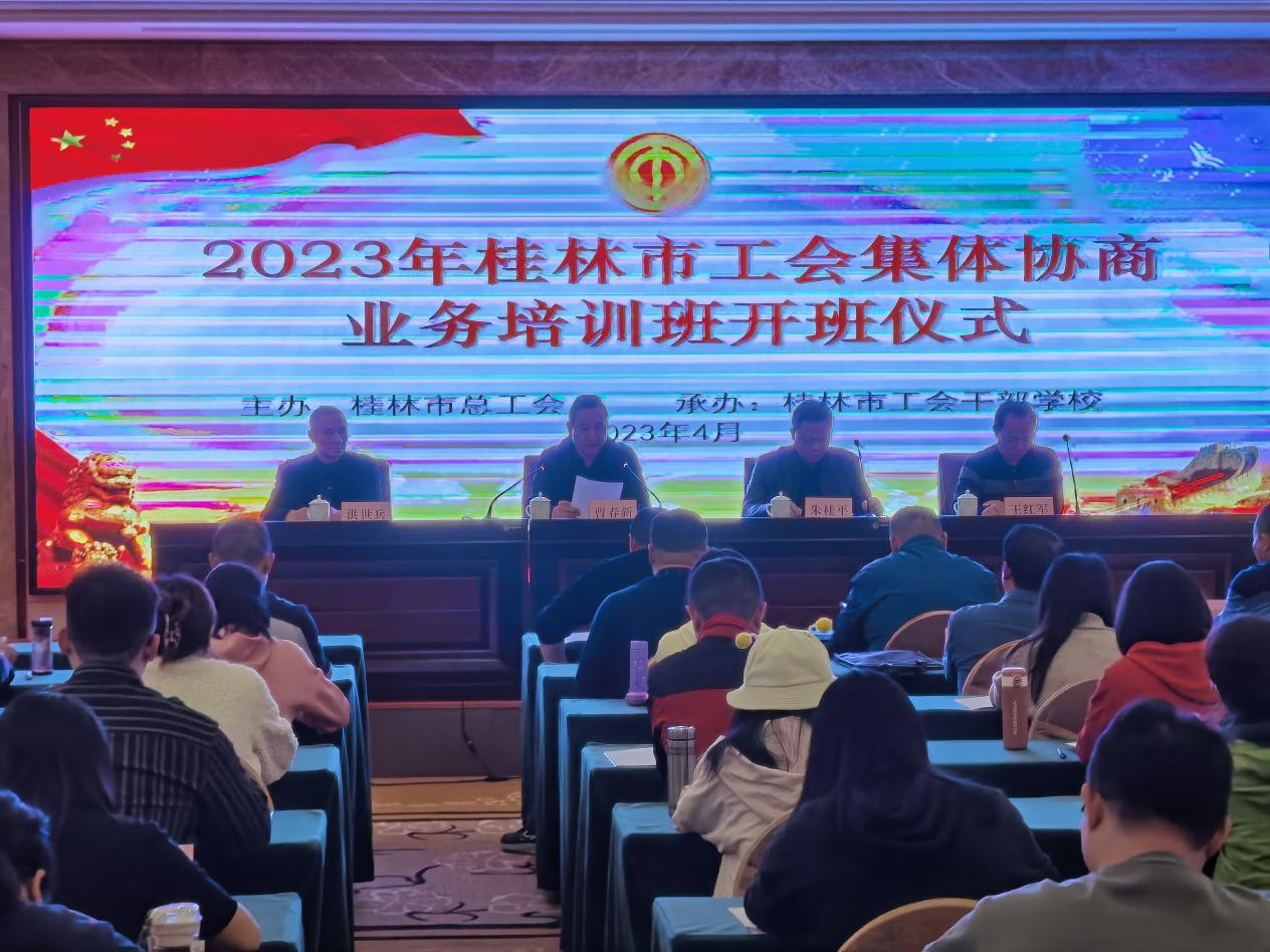 4月14日,桂林市總工會主辦、我校承辦的2023年桂林市工會集體協(xié)商業(yè)務(wù)培訓(xùn)班在龍勝縣圓滿結(jié)束。市協(xié)調(diào)勞動關(guān)系三方委員會成員單位領(lǐng)導(dǎo)、各縣(市、區(qū))總工會分管領(lǐng)導(dǎo)、新培育典型企業(yè)(行業(yè))工會主席、工資集體協(xié)商專職指導(dǎo)員,市直管企業(yè)工會主席、有關(guān)產(chǎn)業(yè)工會主席和有關(guān)產(chǎn)業(yè)工會所屬企業(yè)工會主席、市直管行業(yè)工會主席及工會干部等近100人參加培訓(xùn)。市總工會黨組成員曹春新、市人力資源和社會保障局副局長朱桂平、市工商聯(lián)經(jīng)濟聯(lián)絡(luò)部部長洪世兵、市企業(yè)與企業(yè)家聯(lián)合會秘書長王紅軍出席開班儀式。