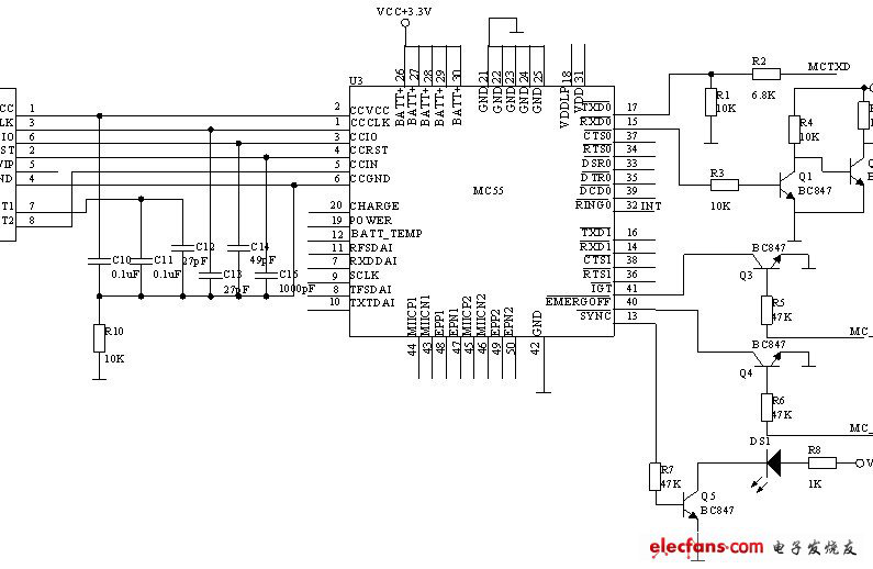 由于現(xiàn)場圖片需要以彩信的形式發(fā)送, 所以選用了帶有彩信功能的無線模塊, 這里選用的GPRS模塊是西門子的MC55,GPRS 模塊和單片機之間的數(shù)據(jù)通信主要是通過端口TXD0 與TXD1 之間,RXD0 與RXD1 之間的數(shù)據(jù)傳輸來完成。其中GPRS模塊上的TXD0 口是用于接收從單片機傳來的數(shù)據(jù), 而單片機上的擴展TXD2 端口是用于向GPRS模塊傳送數(shù)據(jù)的。GPRS 模塊上的RXD0 口是用于向單片機發(fā)送數(shù)據(jù), 單片機的擴展RXD2 口則是用于接收從 GPRS 模塊傳輸來的數(shù)據(jù)。